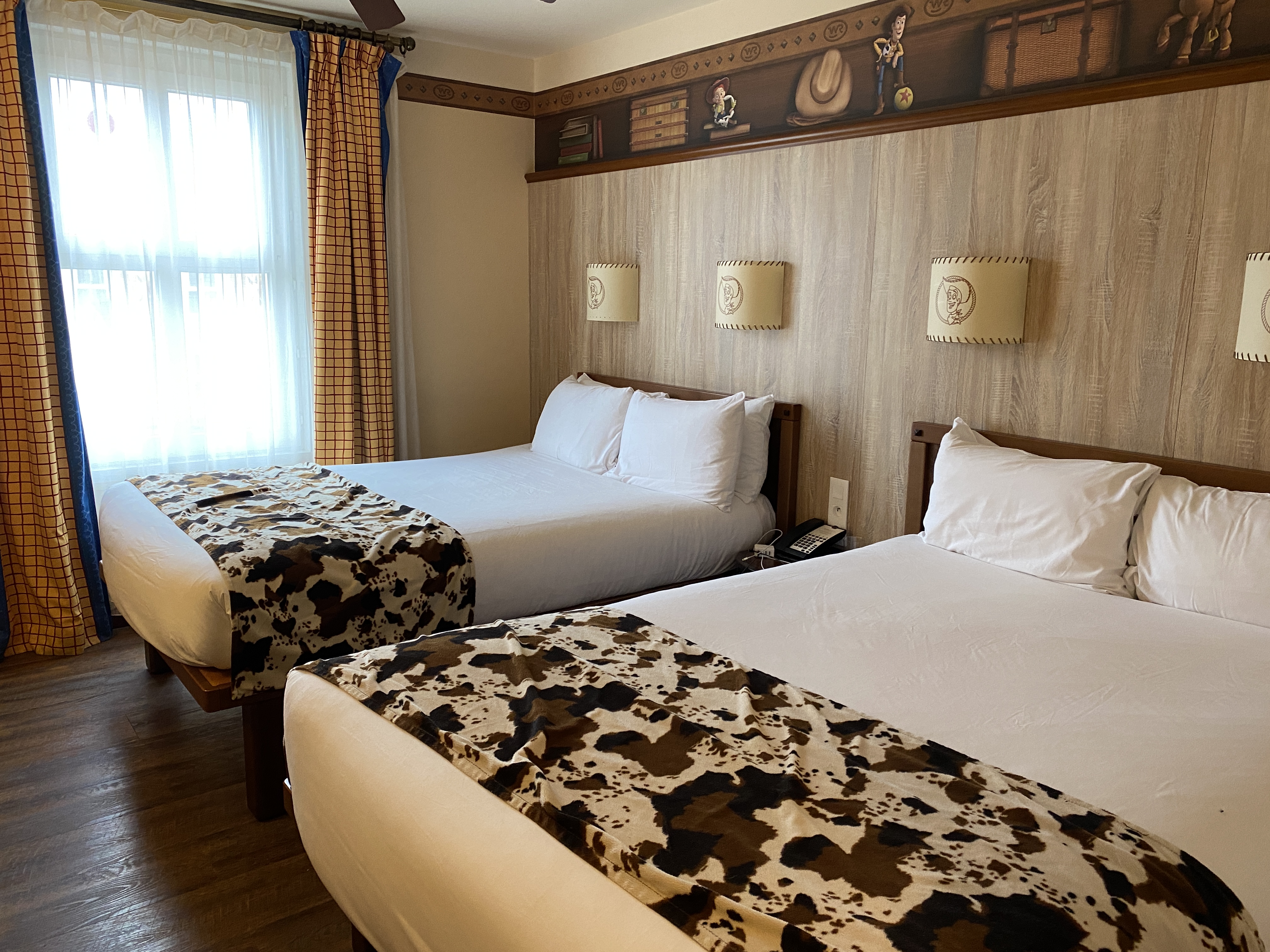The rooms at Hotel Cheyenne are cozy and comfortable, with most featuring one double bed and a pull-out sofa bed, accommodating up to four adults. Known as Woody’s Roundup Rooms, they boast charming Toy Story theming, including nice theming details such as a cowboy boot lamp and a horseshoe mirror. Here’s what you can expect in your room: