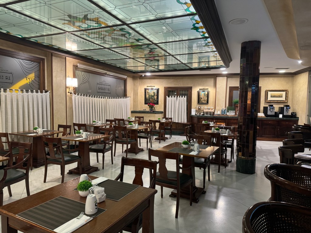 Sercotel Palacio de los Gamboa beautifully blends old-world charm with modern conveniences. The reception area is a highlight, featuring elegant seating, wood-paneled balconies, and a stunning stained-glass roof that adds to the hotel’s historic character.
